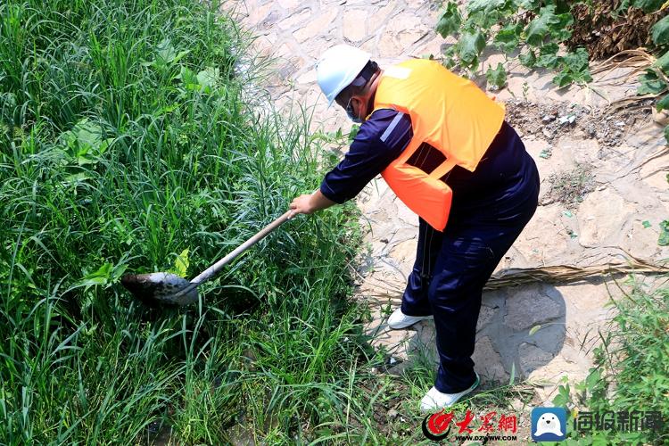 8月3日上午,室外温度逼近35℃,巡查人员身穿反光背心、头戴安全帽、手拿铁锨像往常一样在宋化泉水库进水口和拦污栅捞杂草杂物。顶着烈日,尽管防护到位,大众网·海报新闻记者还是看到巡查员的脸颊上出现了密集的汗珠。